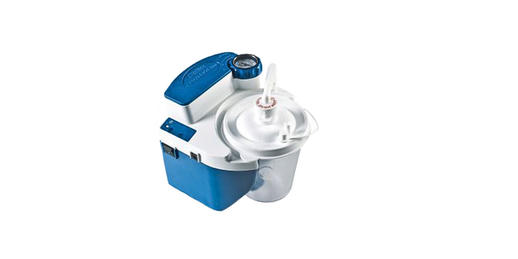 Aspirador de secreciones alimentado por batería o corriente eléctrica que permite realizar aspiraciones en caso de emergencia.