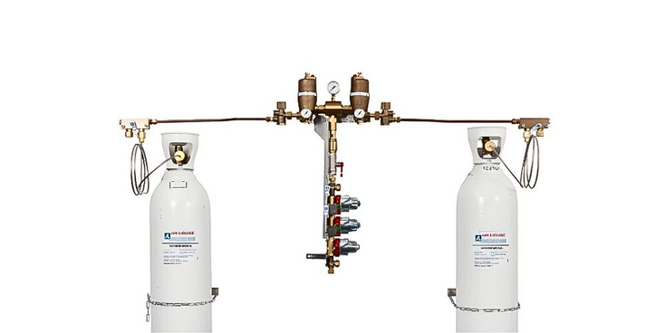 La central de cambio automático CENTREOLE permite un suministro ininterrumpido de una red de gas a partir de 2 grupos de botellas o bloques de botellas.
