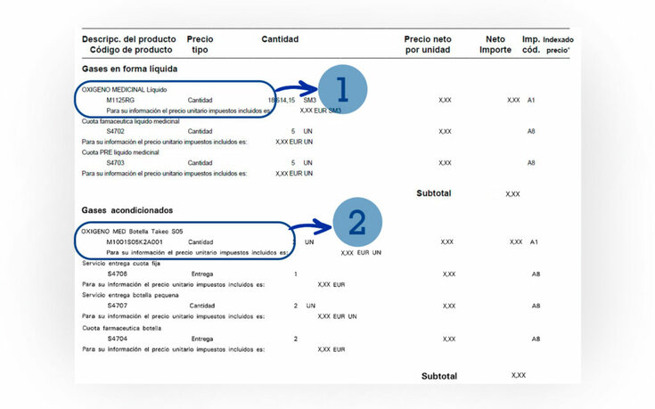 - Gases acondicionados. Aparece una línea resumen por cada referencia suministrada en el periodo de facturación que reflejará el total de las cantidades entregadas expresadas en la unidad de medida/precio según contrato.