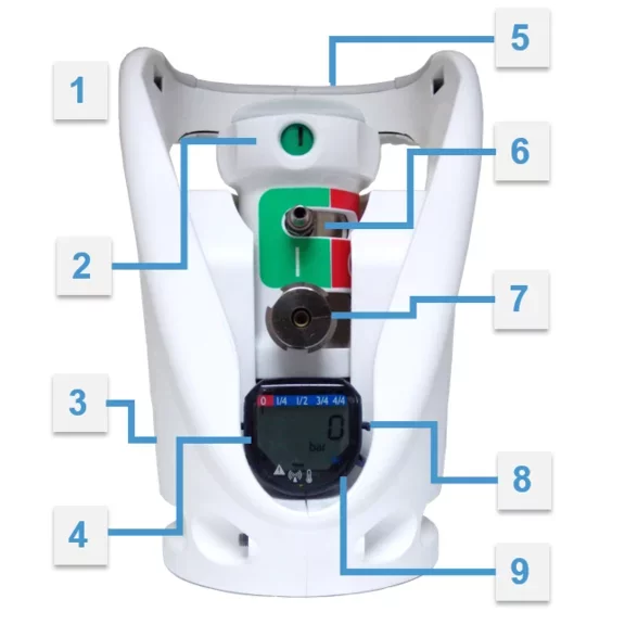 - Válvula VIPR (Valve Integrated Pressure Reducer): Grifo con reductor de Présion Integrado. Son los grifos que se encuentran en las botellas TAKEO™, Compactas y Oyan.